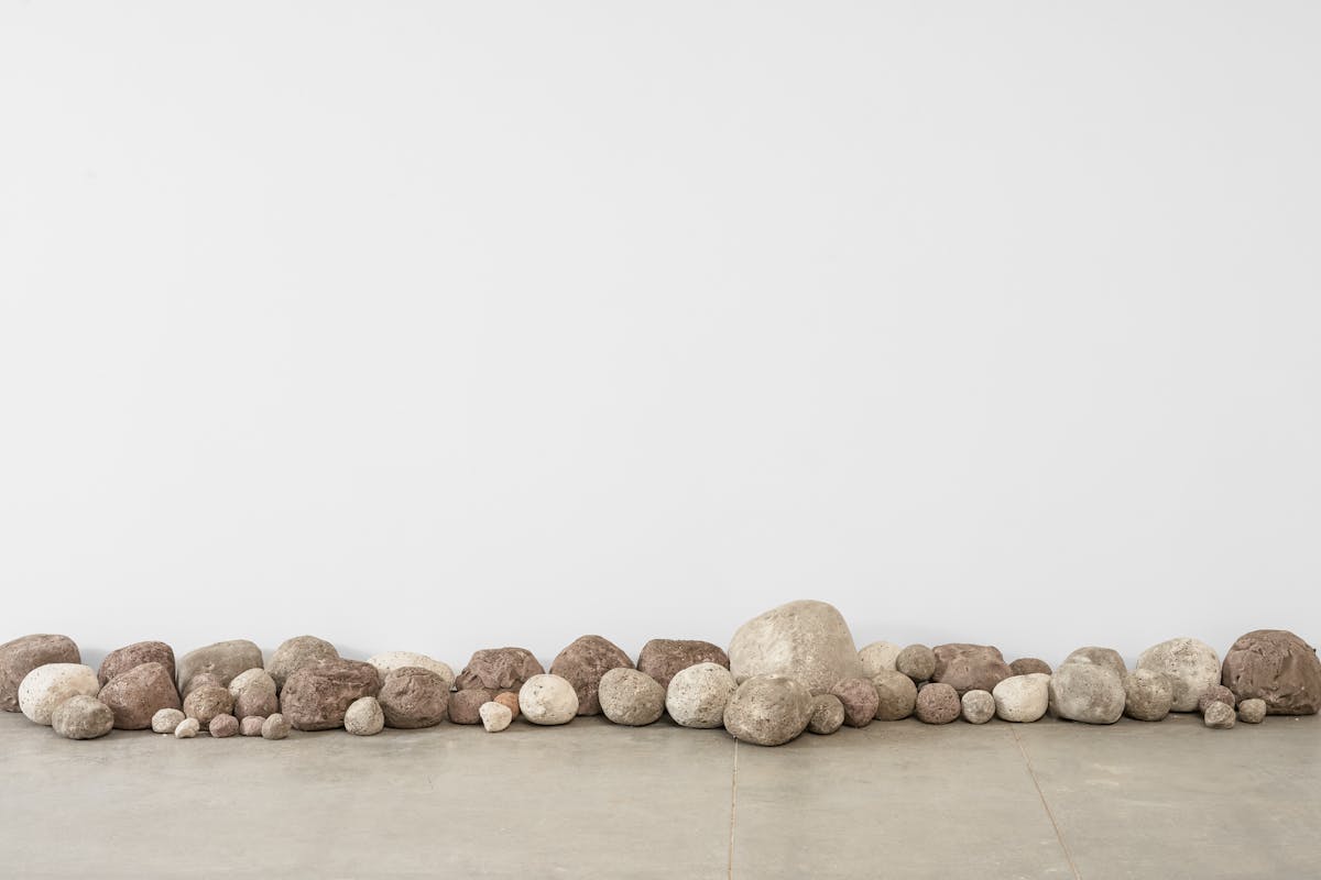 Pictured: Smog Stones, 2020-Smog, Carbon Monoxide (CO), Sulfur Dioxide (SO2), Nitrogen Dioxide ( NO2), Ground Level Ozone(O3), ,Particulate Matter (PM2.5 and PM10), soot, dirt, dust, guano, automobile tire microplastics, and other unidentified debris collected from various streets across Los Angeles CountyDimensions VaryThese stones, which are meant to resemble the river stones that decorate freeway mediums and exits, were created by rolling a ball of clay around different streets in Los Angeles. Each stone corresponds to a specific region in the city and functions as a single-layered record of the polluted ground in which they were rolled onto. These stones unearth the ecological, racial, and class dynamics that dictate Los Angeles’ built environment.Rocks with a darker coloration were rolled in areas that are primarily near freeways and industrial parks.