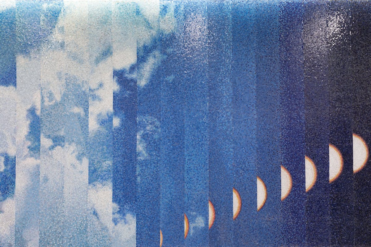 Méndez’ process came to life as she strung together atmospheric slices at 15-minute intervals to create a 24-hour time-lapse from morning to night—a translucent blue and white mosaic entitled At the Same Time. To supplement the panoramic piece within the station, a second mosaic invites riders to find similitude with another commuter—the Arctic Tern, the longest distance traveling bird in the world. Méndez offers riders a view of celestial sunbeams against a wing of the special creature.